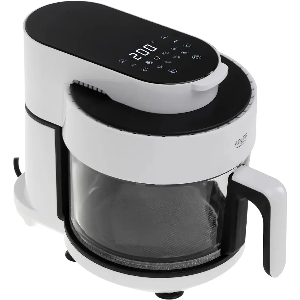 Аерофритюрниця Adler AD 6316 - сучасний прилад для приготування їжі без використання жиру. Пристрій використовує конвекційну технологію в поєднанні з галогенним нагрівачем для швидкого і рівномірного приготування страв. Скляна чаша дає змогу візуально контролювати процес приготування, а сенсорна панель керування з білим світлодіодним дисплеєм забезпечує зручне налаштування режимів.