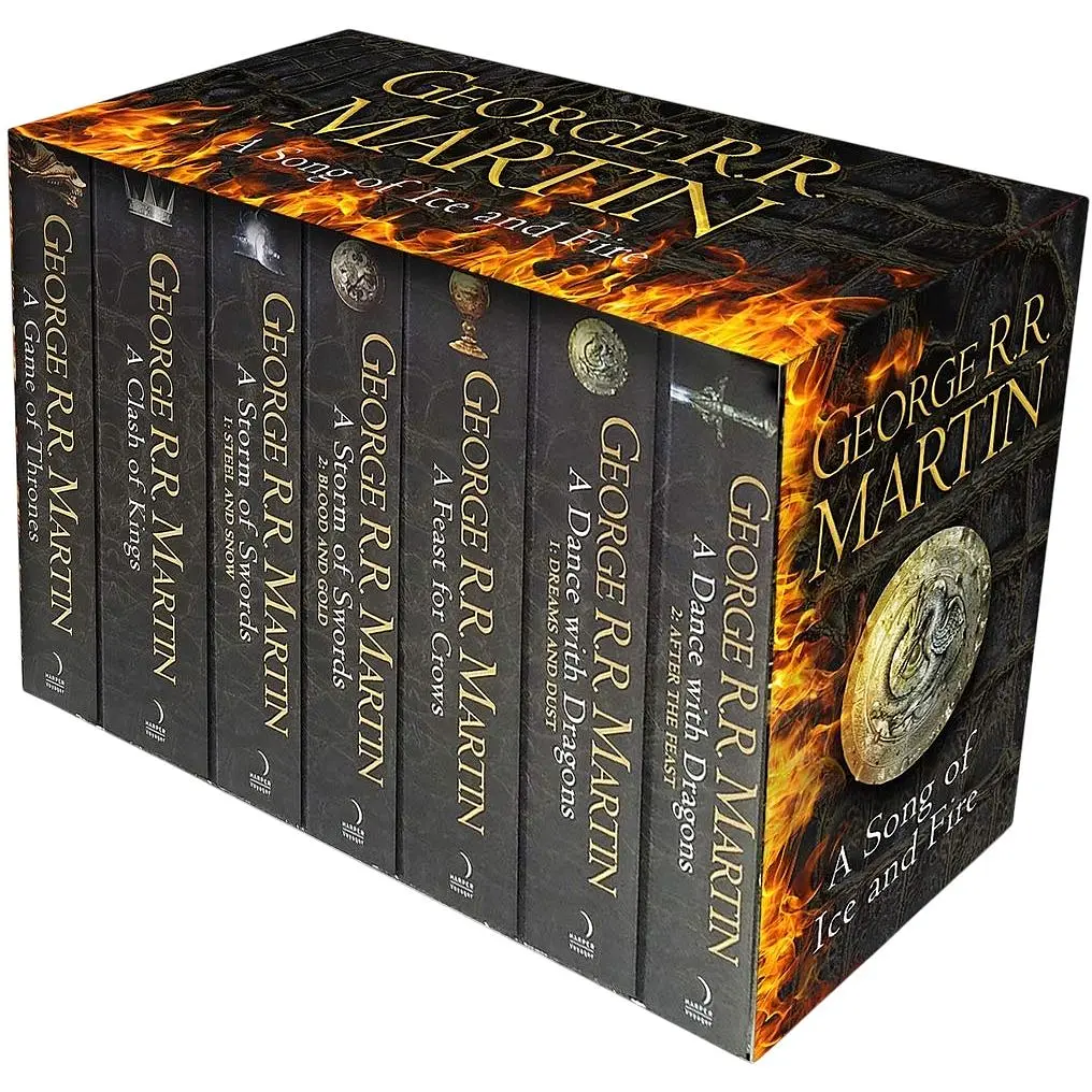 This boxset includes: A Game of Thrones, A Clash of Kings, A Storm of Swords 1: Steel & Snow, A Storm of Swords 2: Blood & Gold, A Feast for Crows, A Dance with Dragons 1: Dreams & Dust, A Dance with Dragons 2: After the Feast.