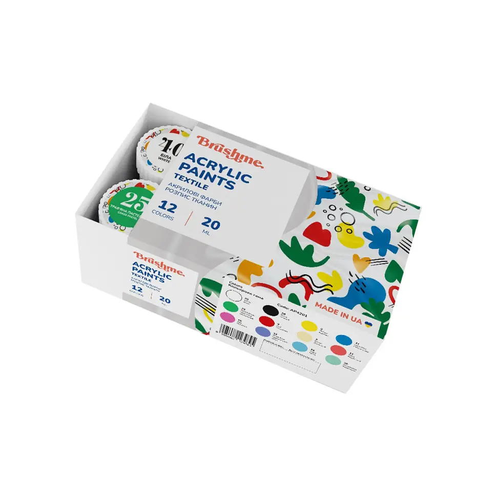 Текстильні фарби Brushme для реалізації ваших творчих ідей на тканинах. В набір входять: 12 Базових кольорів: білий, чорний, жовтий, синій, трав'яний пастельний, червоний, кремовий, кораловий, рожевий, королівський синій, топаз, аквамарин Набір підходить для для розпису тканин. Об'єм баночок: 20 мл Зверніть увагу, що текстильні фарби будуть зафіксовані остаточно через 48 годин після закінчення малюнку.Ми радимо не прати речі з малюнками більше ніж при 30 градусах. Найкраще підходить для таких речей делікатний режим прання.