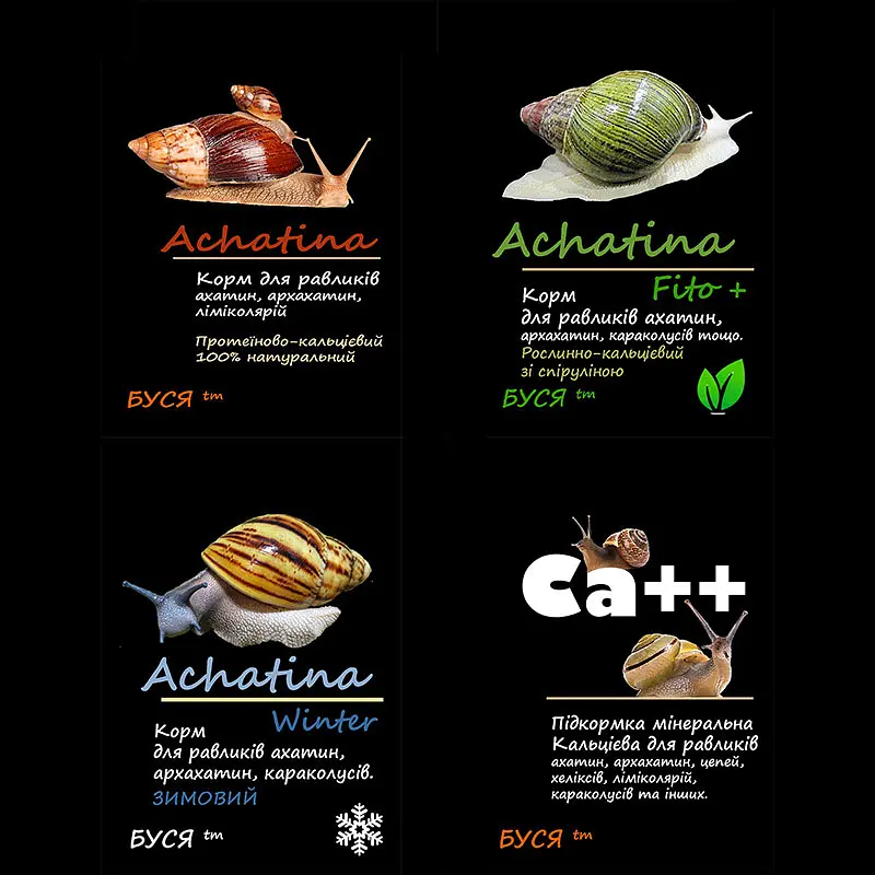 1. "Буся" Achatina. Основний корм для равликів ахатин, архахатин, ліміколярій та ін. протеїново-кальцієвий, 100% натуральний, з сепією.