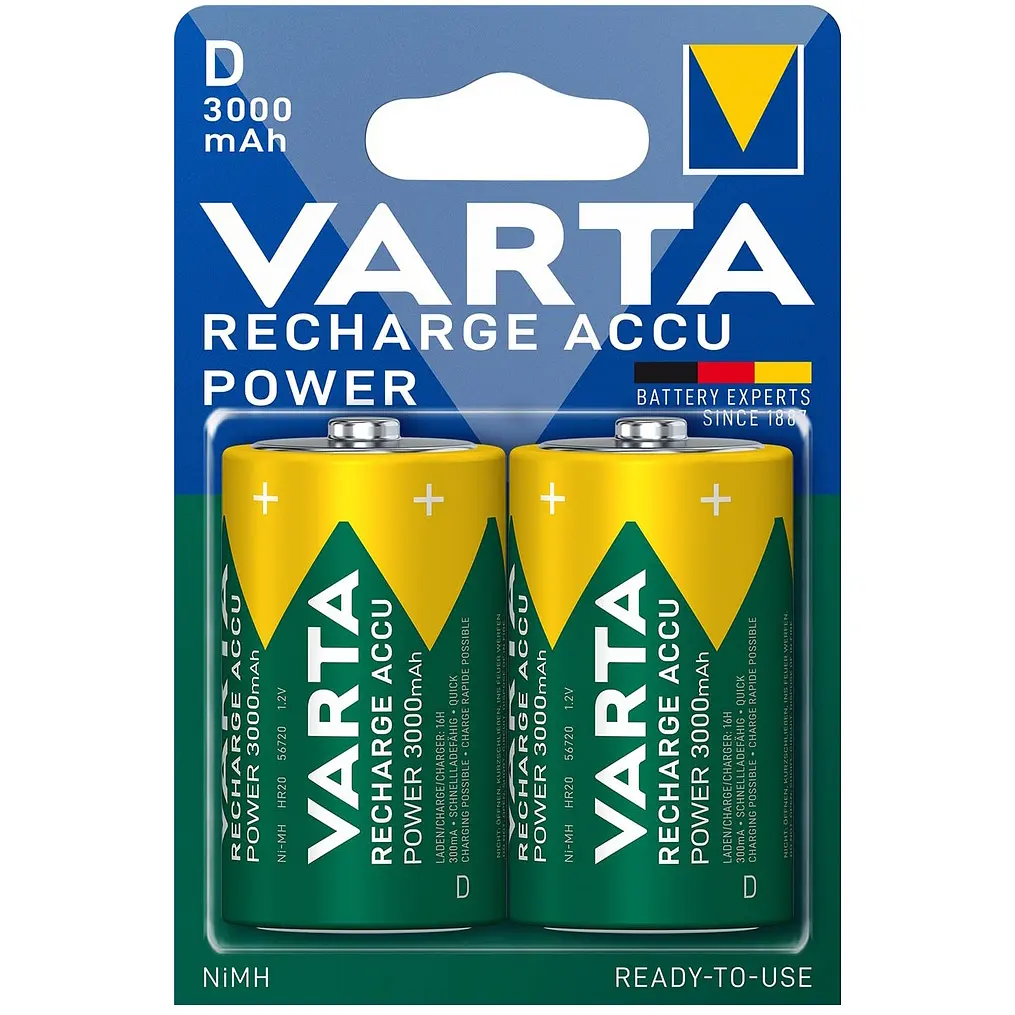 Акумулятори Varta Rechargeable D - нікель-металгідридні акумулятори типу D ємністю 3000 mAh, у наборі 2 шт.