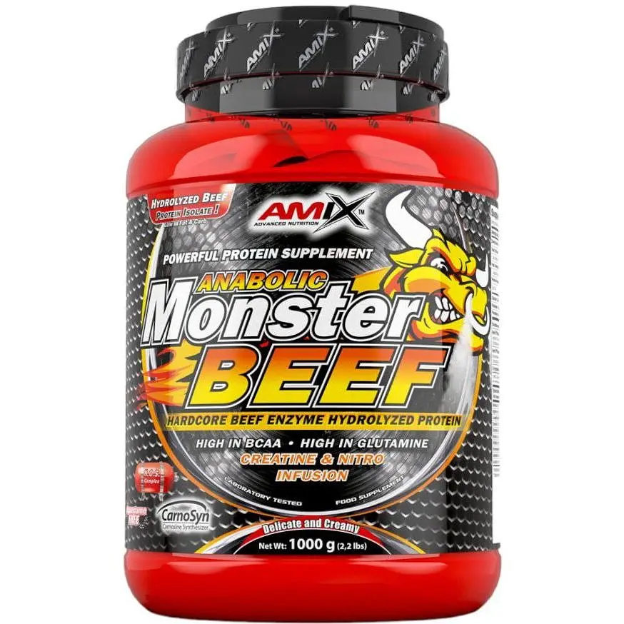 Amix Monster Beef - це високоякісний протеїн, у якому потенціал яловичини був використаний на сто відсотків. Це продукт найвищої якості, який був створений на 90% із гідролізованого яловичого альбуміну, харчова цінність якого перевищує всі відомі сироваткові білки. Яловичий білок відрізняється незвичайно високим вмістом амінокислот, велику групу тут складають екзогенні амінокислоти з розгалуженим ланцюгом BCAA (L-лейцин, L-ізолейцин та L-валін). Вони дозволяють швидко ініціювати анаболічні процеси та забезпечують найбільший захист від шкідливого впливу катаболізму.