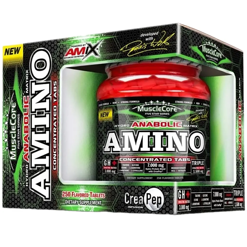 Amix створили мега концентровані двох грамові таблетки, що складаються з набору амінокислот, кератинової матриці (моногідрат, HCL, креатин нітрат) та комплексного протеїну. Добавка добре відновлює після важких фізичних навантажень і сприяє синтезу білка для росту сухої м'язової тканини. Amix MuscleCore Amino збільшує вироблення енергії АТФ для забезпечення високої продуктивності на високоінтенсивних або силових тренуваннях.