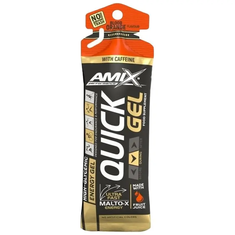 Випробував Amix Quick Gel з кофеїном зі смаком апельсина — сподобався більше, ніж лимонний варіант. Смак яскравіший, нагадує апельсиновий мармелад, але не надто солодкий. Ефект відчувається швидко: приблизно за 10–15 хвилин з’являється прилив сил і концентрація. Ідеально підходить для інтенсивних навантажень або другої половини довгого тренування.
