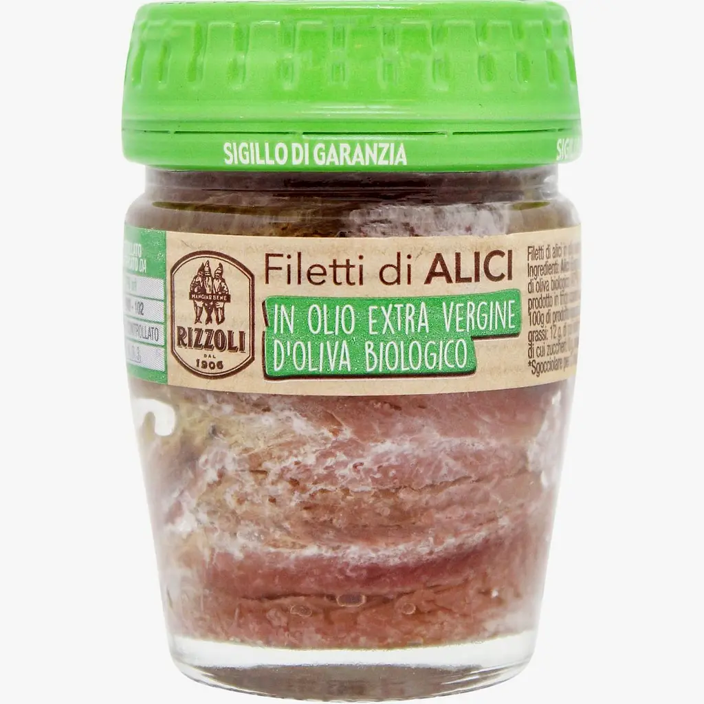 Свіжі анчоуси Rizzoli, виловлені в Середземному морі, проходять шестимісячний період дозрівання. Тільки після того, як наші фахівці виявлять, що досягнуто необхідного ступеня дозрівання, а м'якуш щільний і ароматний, анчоуси заливають оливковою олією. Плоский або згорнутий.