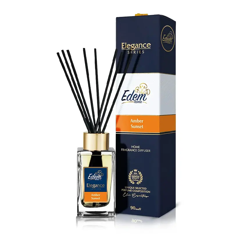 Аромадифузор з паличками Edem Elegance Amber Sunset, 90 мл наповнює простір теплими, затишними нотами амбри, ванілі та ніжного мускусу. Аромат створює атмосферу спокою й гармонії, нагадуючи м’яке світло вечірнього сонця.