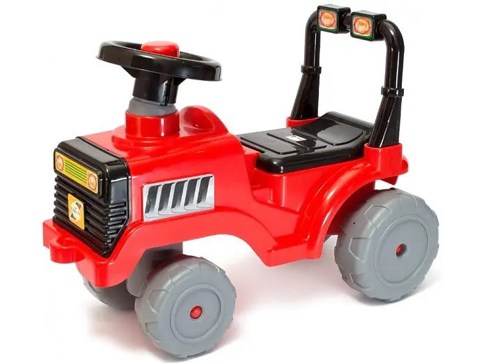 За допомогою керма направляються передні колеса. Під сидінням передбачена зона для дрібних речей або іграшок. Стійкість машинки забезпечується широкими колесами.