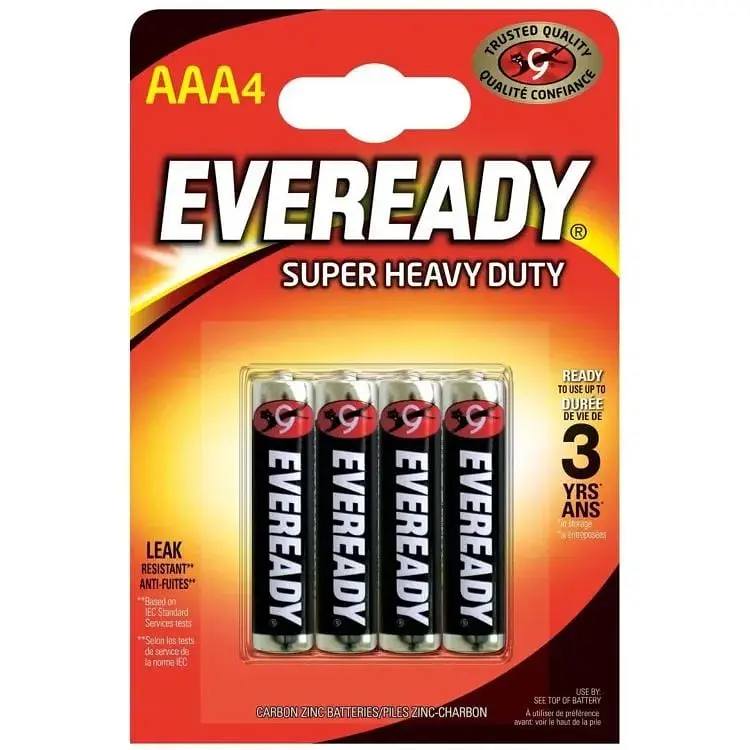 Батарейка ENERGIZER EVEREADY AAA Heavy Duty 4шт. Компанія Energizer є лідером у галузі виробництва батарейок із моменту винаходу першої у світі побутової батарейки у 1896 році. Наш дух новаторства в поєднанні з соціальною відповідальністю і прагненням досягти високих результатів - ось те, що зробило Energizer провідним виробником побутових батарейок, а також продаваним брендом No1 в галузі спеціальних і акумуляторних батарейок у всьому світі. Батарейка Energizer Eveready є доступним і універсальним рішенням на кожен день. Батарейки Energizer Eveready AAA Super Heavy Duty використовуються для живлення різних електроприладів. Напруга: 1,5 V Типорозмір: AAA Тип батареї: сольова Кількість у пакунку: 4 шт. Виробник: Energizer, Индонезия Ціна за паковання з 4 шт. Id ci790182