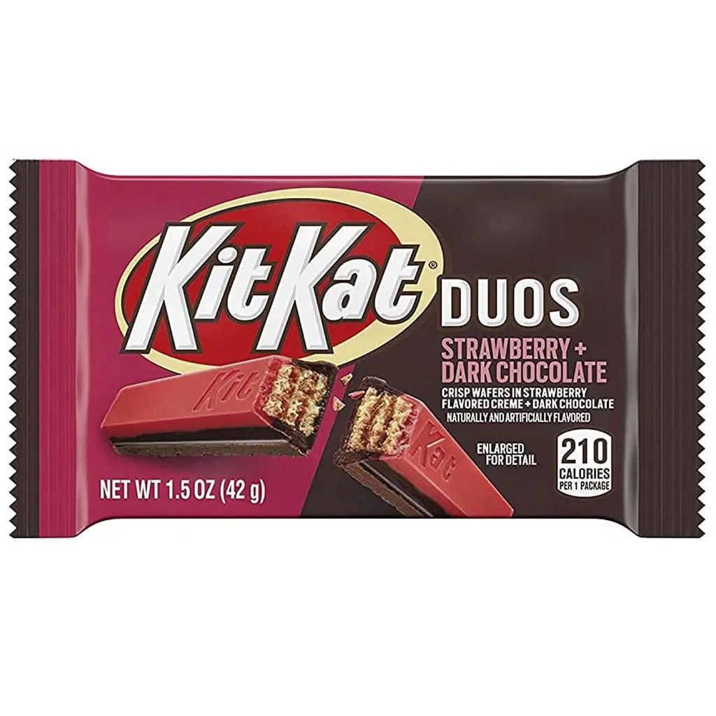 Батончик Kit Kat Duos Strawberry and Dark Chocolate Candy Bar містить вафельні пластинки, просочені ванільним кремом та покриті чорним шоколадом з полуницею.