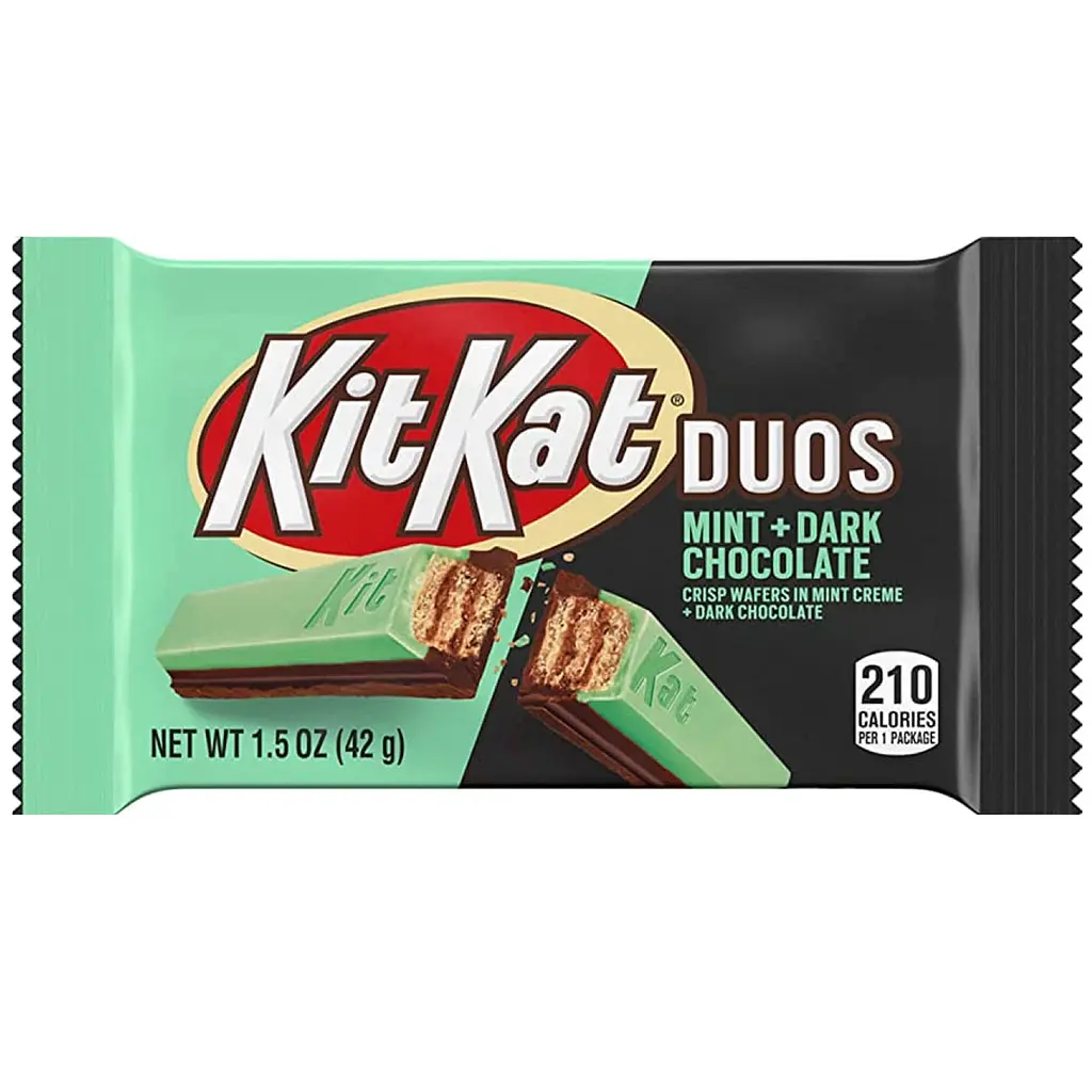 Батончик Kit Kat Duos Mint and Dark Chocolate Candy Bar містить вафельні пластинки, просочені ванільним кремом та покриті чорним шоколадом з м'ятою. Це п'янкий і освіжувальний аромат м'яти в суперських вафельних пластинках.