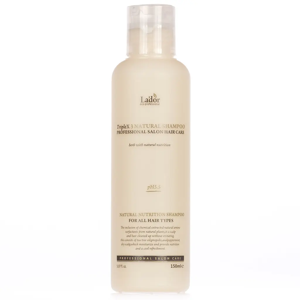 Triplex Natural Shampoo — органічний шампунь бренда La'dor містить екологічно чисті екстракти та ефірні масла. Мийна основа шампуню натуральна і м'яка, вона очищає від забруднень, не пошкоджуючи волосся. Засіб нормалізує pH-баланс шкіри голови, позбавляє від лупи і стимулює ріст волосся.