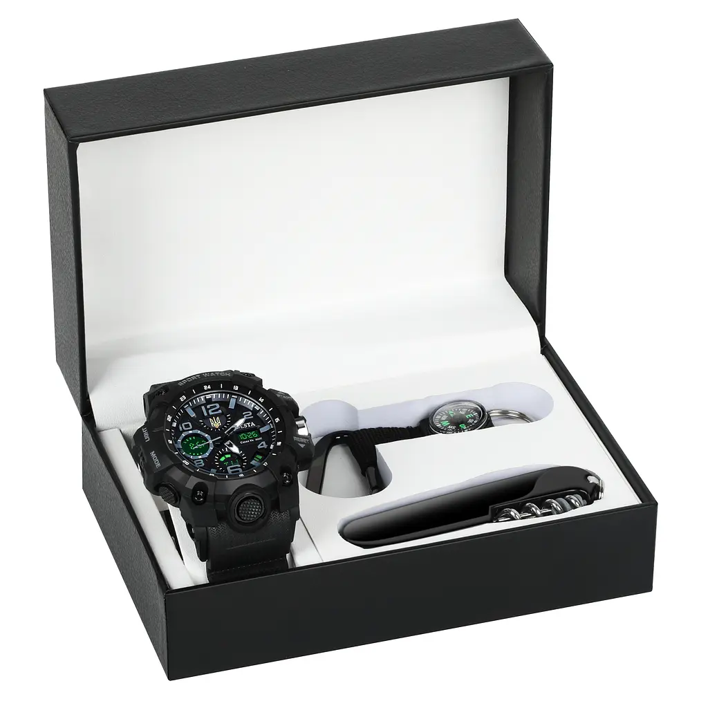 Besta Box Peremoga Set - унікальний подарунковий набір для себе або найближчих. Набір складається із тактичного годинника, ножа, застібки з компасом та елегантної фірмової подарункової коробочки.Besta Peremoga - лімітована версія популярної моделі Besta з тризубом. Besta – це молодий український бренд якісних годинників. Годинник має витончений дизайн та якісний японський механізм. Він розроблений спеціально для важких умов, витримує підвищені навантаження, холод до -30 та потрапляння води до 3-х метрів. Проєктування, розробка та головний офіс бренду знаходяться в Україні, збірка відбувається в Китаї, що дає змогу забезпечити найкращу ціну при високій якості. На задній стороні годинника виконане витончене гравіювання Героям Слава та тризуб!❤В комплекті йде офіційна гарантія на 12 місяців.