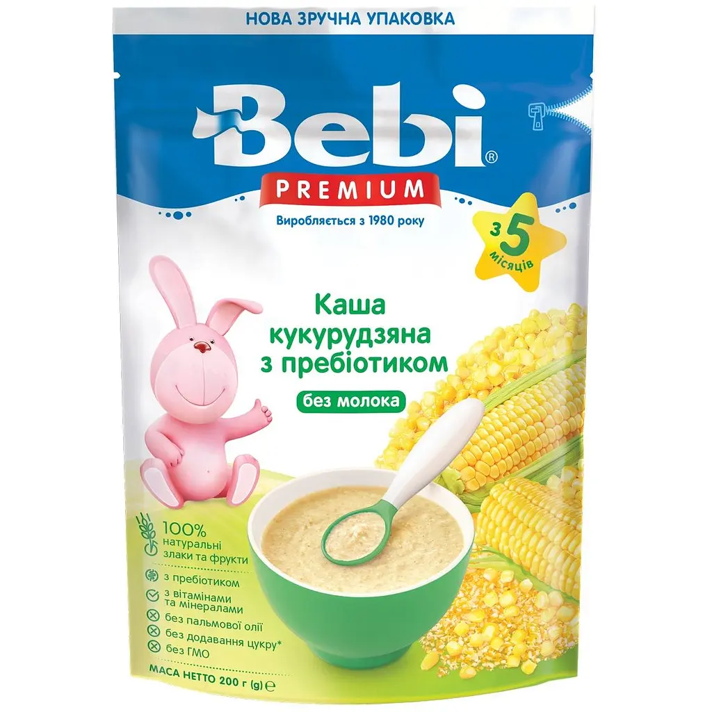 Безмолочна кукурудзяна каша Bebi Premium для дітей з 5 місяців. Натуральні злаки, комплекс з вітамінів і мінералів, і легкість у приготуванні роблять кашу ідеальним вибором для першого прикорму.