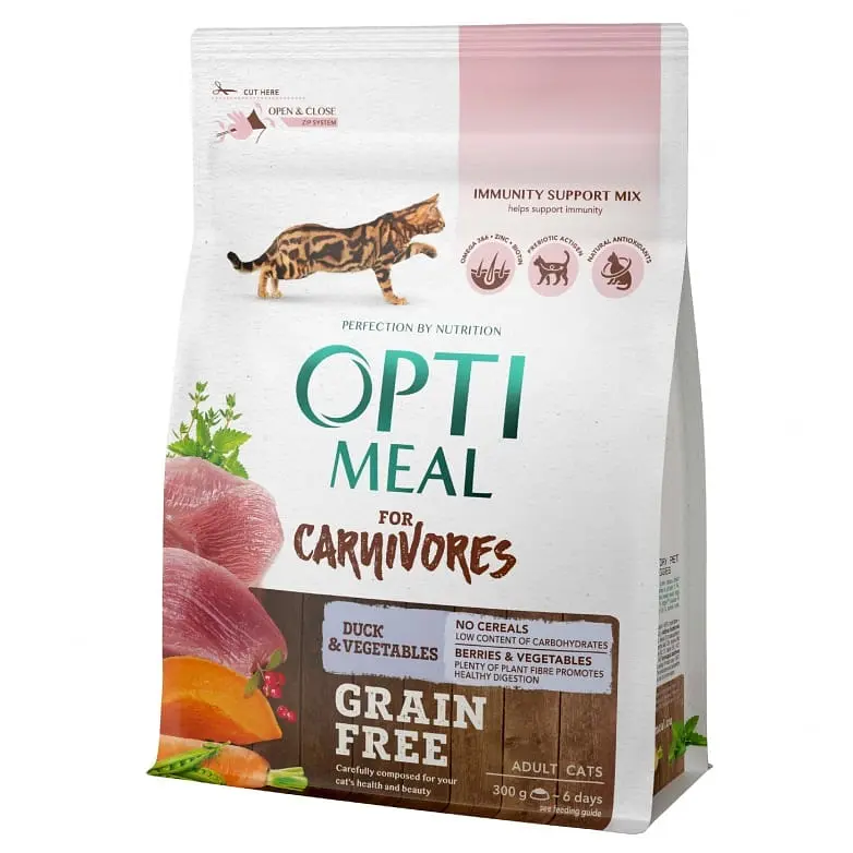 Беззерновий сухий корм для котів Optimeal (Оптимил) качка та овочі забезпечить збалансований раціон із багатим вмістом поживних компонентів.