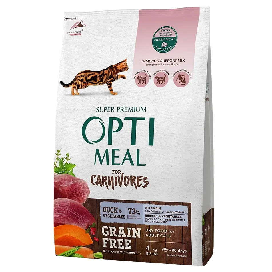 Беззерновий сухий корм для котів Optimeal (Оптимил) качка та овочі забезпечить збалансований раціон із багатим вмістом поживних компонентів.
