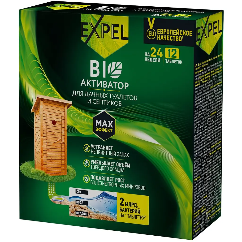 Інноваційний засіб Expel для дачних туалетів та септиків має склад із високоактивними бактеріями, які допомагають розкладанню органічних відходів та перетворюють їх на безпечний для навколишнього середовища продукт. Біоактиватор ефективно працює при температурі 5°C і вище, але у рідкому середовищі.