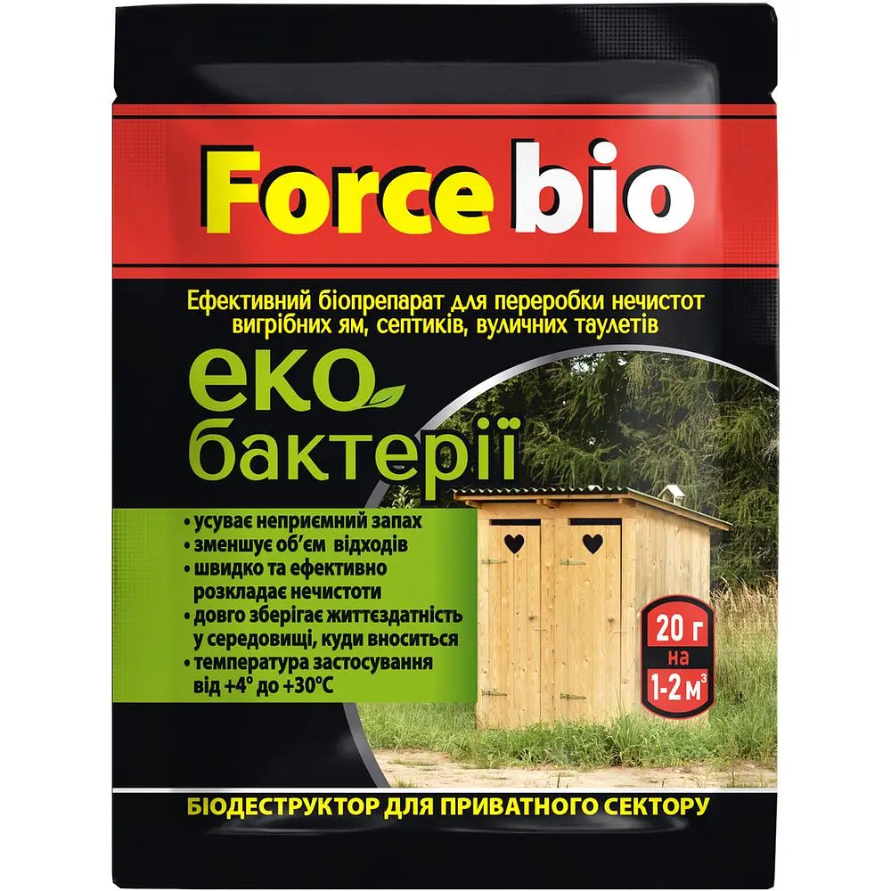 При попаданні в вигрібну яму, туалет чи септик біопрепарат FORCE BIO переробляє нечистоти у воду, вуглекислий газ та легкий осад, що є добривом, збагаченим органічним азотом.