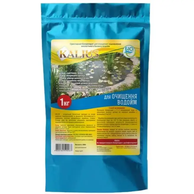 Kalius - це безпечний та ефективний препарат для очищення водойм від шкідливих мікроорганізмів та відновлення екологічного балансу водойм. Застосовується в природних, штучних, декоративних водоймах, ставків. Очищує воду від органічних забруднень, прискорюючи природні біологічні процеси самоочищення.