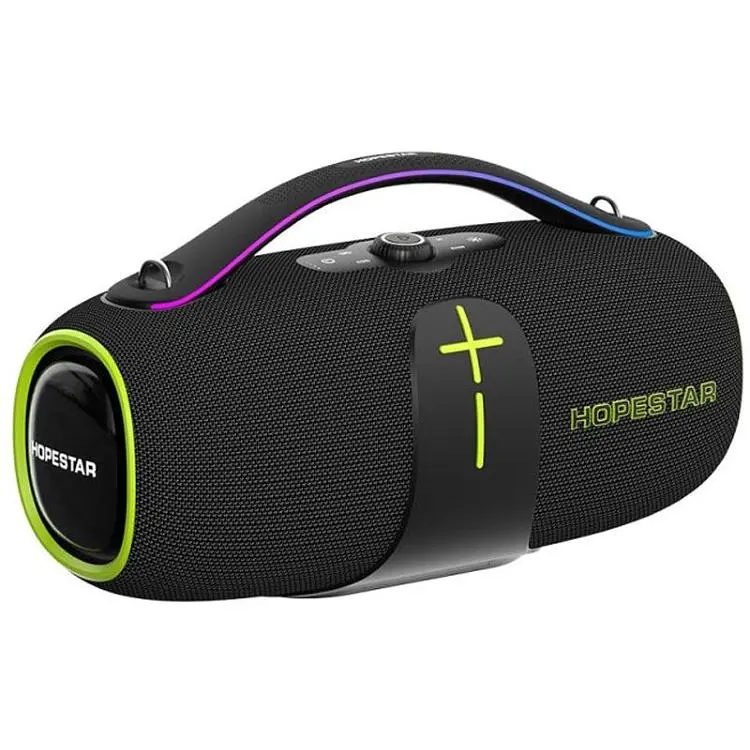 Колонка Hopestar A85 поєднує в собі передові технології та стильний дизайн. Вона виготовлена з міцних матеріалів: пластику, металевих елементів та тканинної акустичної сітки, що забезпечує довговічність та стійкість до зовнішніх впливів. Розміри пристрою складають 380 × 170 × 170 мм, а вага — 5–6 кг, що робить її досить компактною для перенесення.