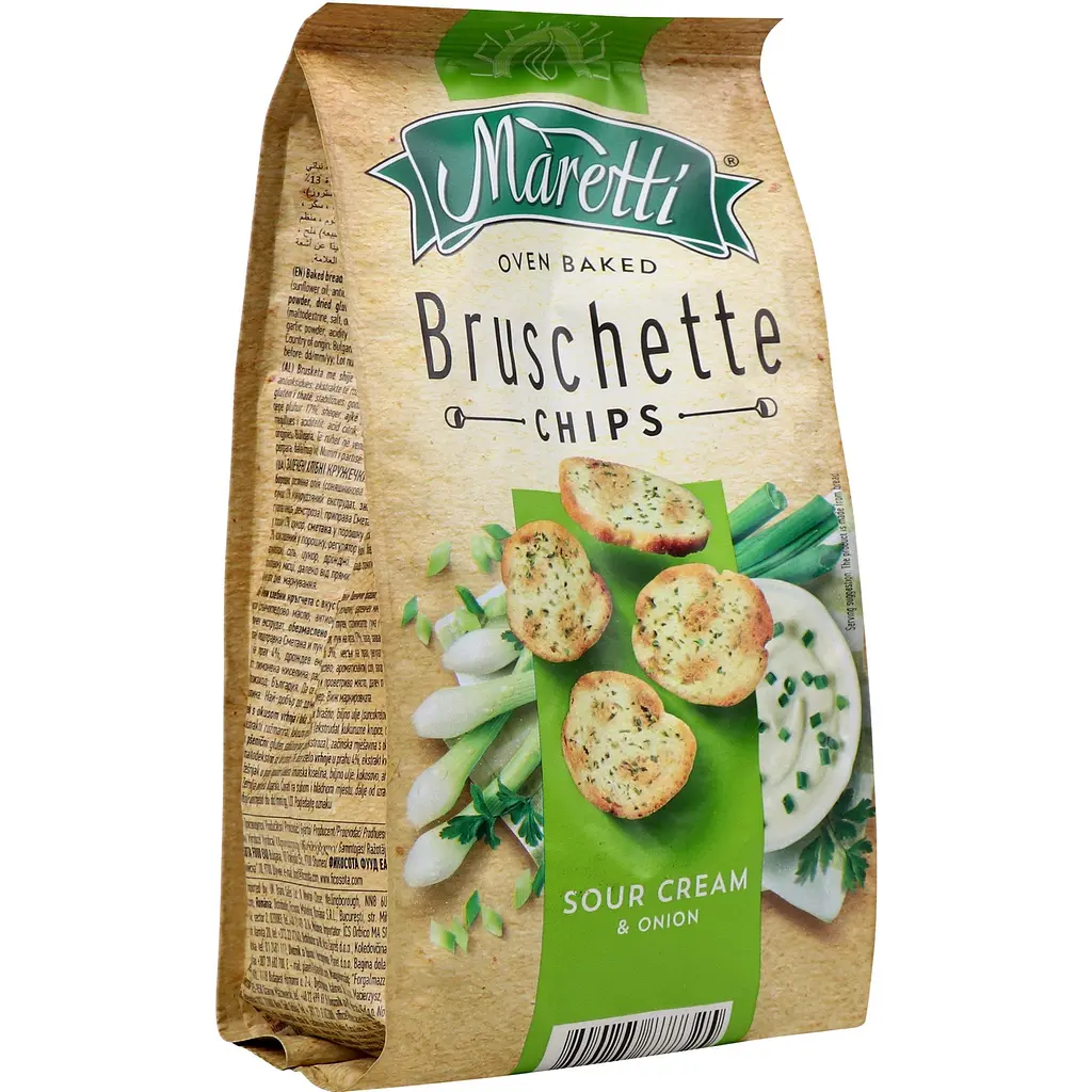 Брускети Maretti Сметана з цибулею - традиційна страва італійської кухні у вигляді сухариків, нарізаних тонкими круглими скибочками з додаванням ароматної рослинної олії та запашних спецій. Смак цибулі та сметани, дуже вдало поєднується та вносить ноти пікантності хлібним брускетам.