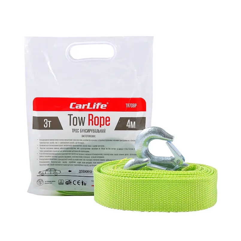 Трос для буксирування CarLife TR708/P з кріпленням за рахунок двох гаків, запакований у блістер. Буксирувальний трос - це доступний вибір відмінної якості, який допоможе вам в непередбачених обставинах на дорозі.