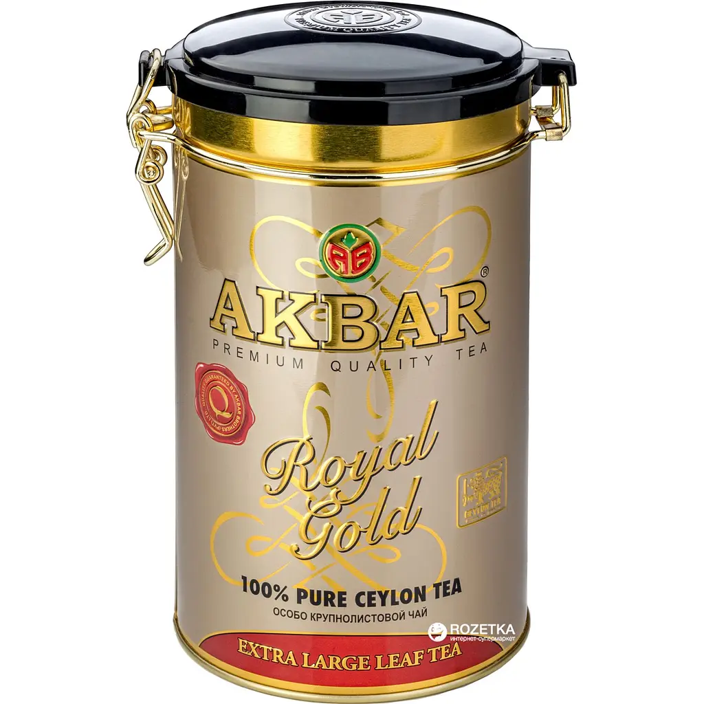 Чай Akbar Royal Gold - неперевершений чорний крупнолистовий цейлонський чай вищого сорту, вирощений у високогір'ї Шрі-Ланки, поєднує в собі силу і характер. Родзинкою напою є неперевершений аромат і смак, а також своя текстура і глибокий яскраво-золотистий колір. Ще однією особливістю цього чаю є молоді чайні листки сорту Orang Pekoe - королівський чай з особливо великими листками.