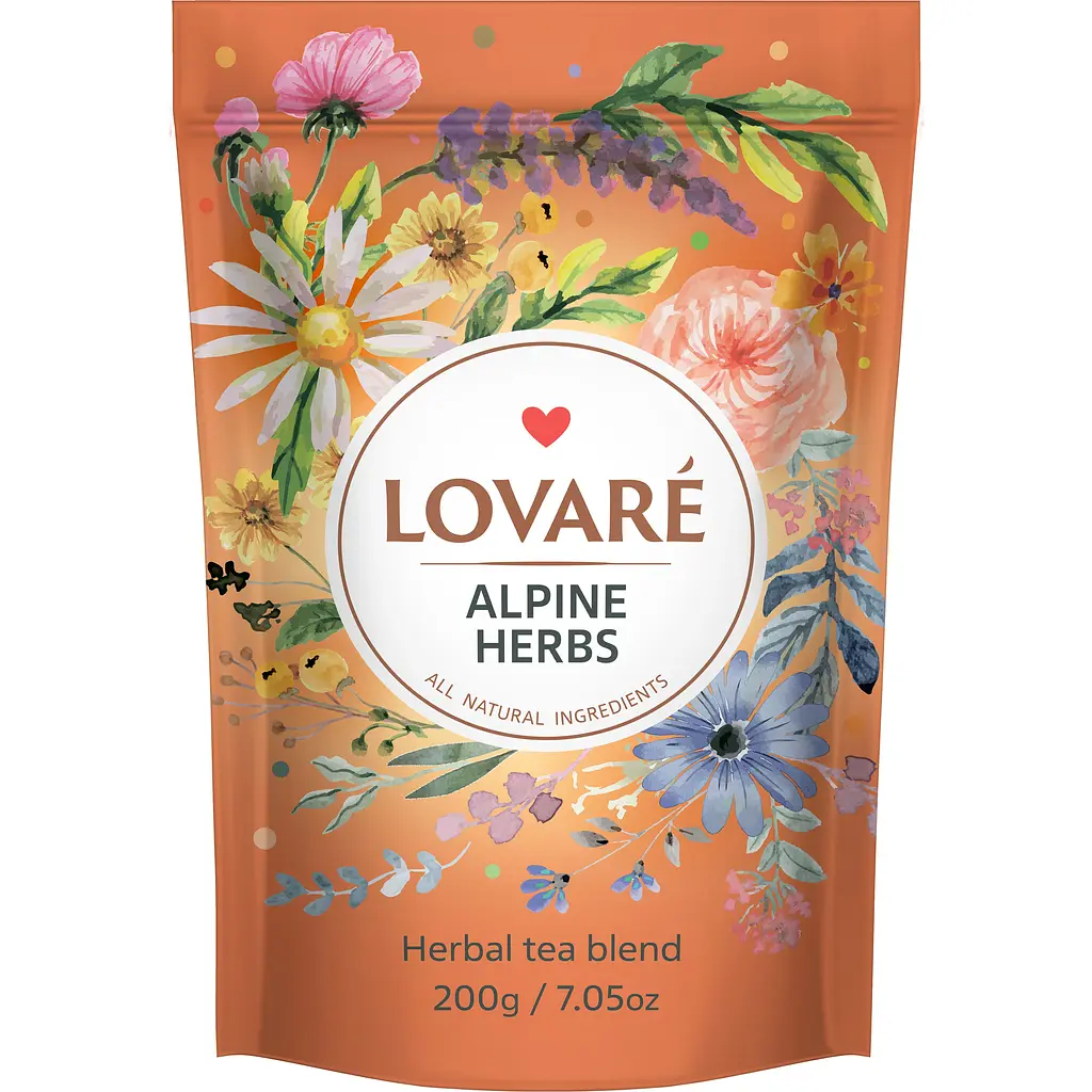 Чай Lovare Alpine herbs - це букет ароматних трав, квітів і фруктів зібраний у композицію. У серці напою - свіжий, цитрусовий смак лемонграсу з нотами апельсина та м'яка ніжність ромашки з виразним квітково-фруктовим акцентом.