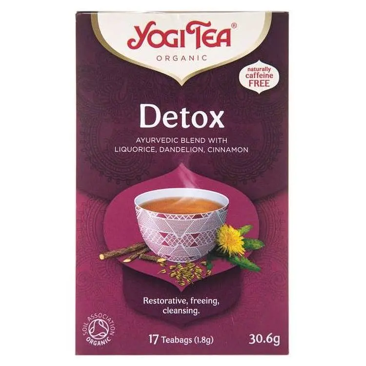 Чай трав'яний Yogi Tea Detox з прянощами являє собою аюрведичну суміш із солодки, кульбаби та кориці.