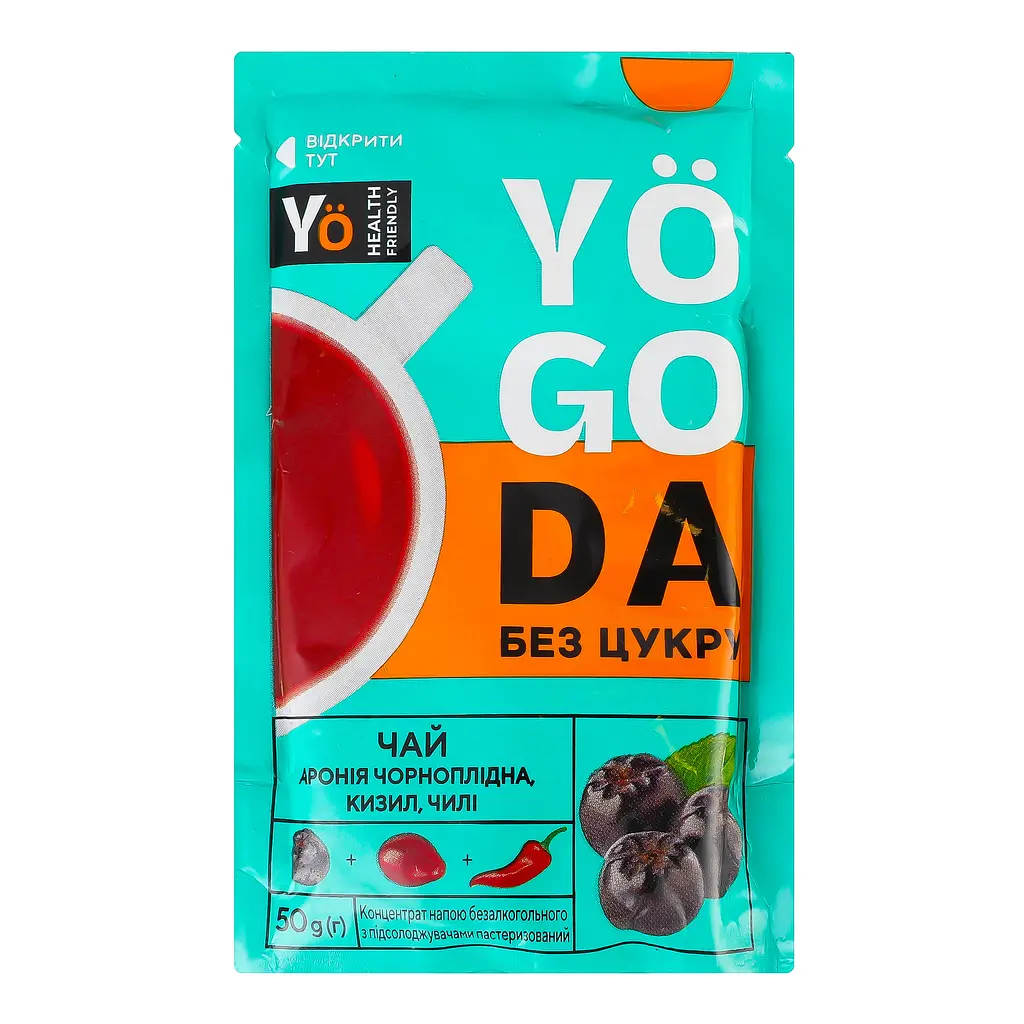 Чай Yogoda Аронія, кизил та чілі має приємний аромат, кисло-солодкий, пікантний смак з легким, терпким зігріваючим продовженням. Чай тонізує м'язову і нервову систему, допомагає швидко відновлюватися після перевантажень. До складу чаю входять такі компоненти, як пюре кизилове, аронія чорноплідна, екстракт стевії натуральний, перець каєнський.