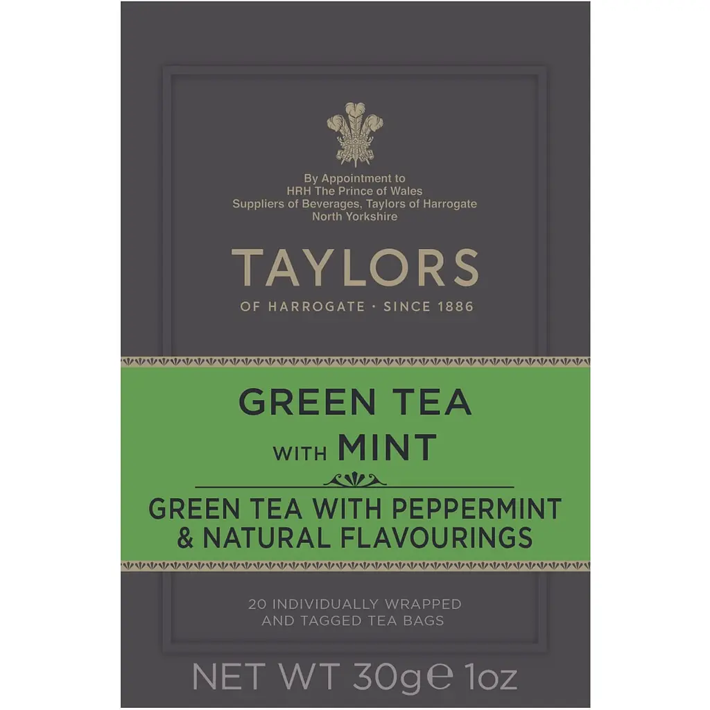 Чай зелений Taylors of Harrogate Green Tea With Mint має неймовірно освіжаючий, легкий та живий смак. Для приготування цього класичного настою використовуються вишукано м'який зелений чай Сенча та найкращий сорт листя перцевої м'яти. Зелений чай та м'ята разом мають чарівний смак, він приємно освіжає у час дня.