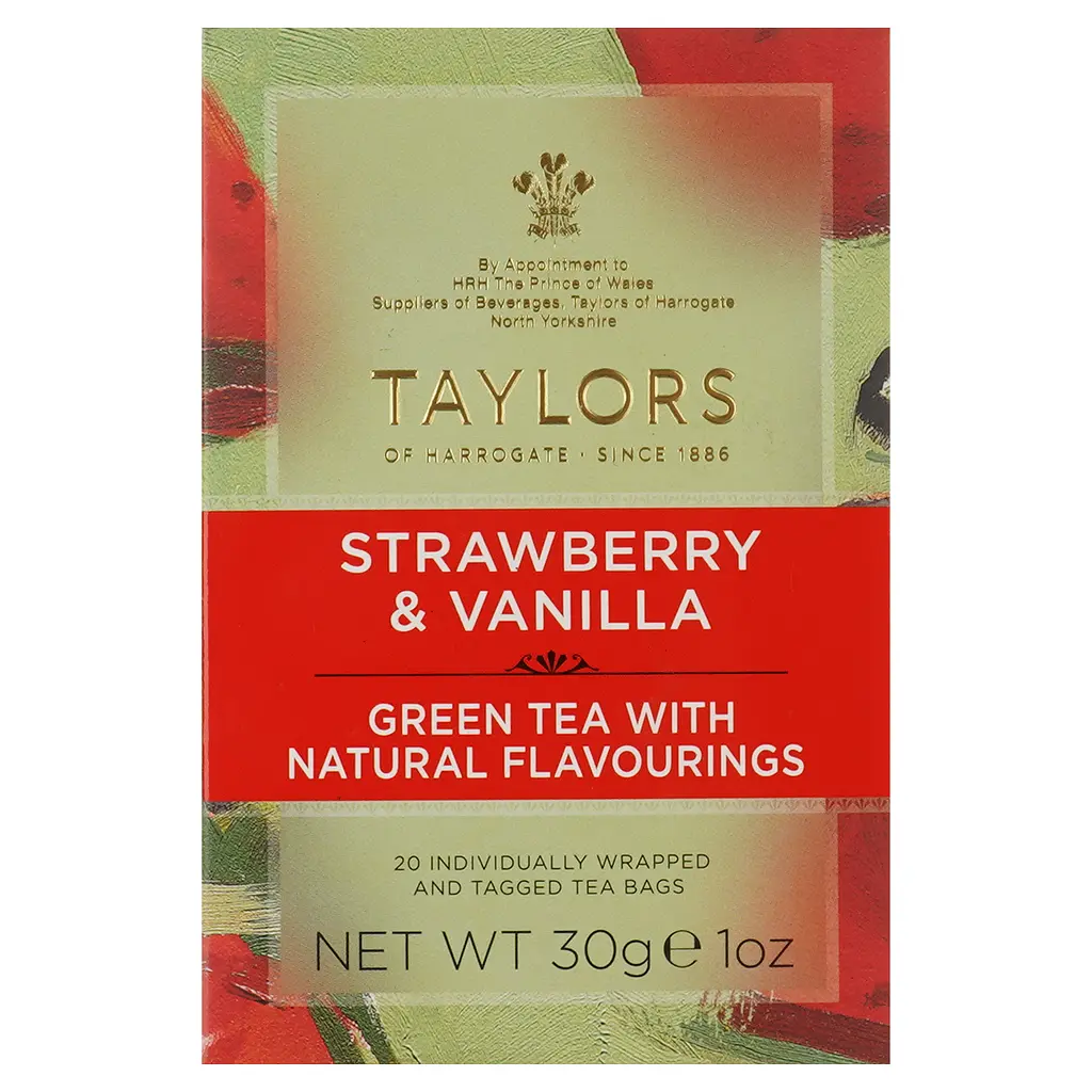 Чай зелений Taylors of Harrogate Strawberry & Vanilla Green Tea - гладкий, соковитий і насичений, цей фруктовий зелений чай пом'якшений ароматами стиглої полуниці та ніжної ванілі. Чай сенча має ніжний і м'який смак зі свіжими квітковими нотами, гармонійно доповнений ароматом полуниці. Полуниця надає фруктової, що піднімає солодощі, а аромат ванілі надає красиву, майже неземну м'якість.