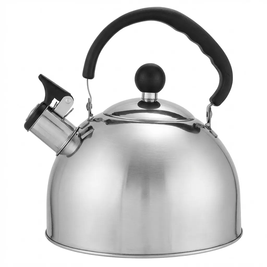 Чайник має об'єм 2.5 л, що ідеально підходить для сім'ї з 4–6 осіб або для чаювання великої компанії. Оснащений широким носиком з вбудованим свистком, який автоматично сповіщає про закипання, герметичною кришкою з нержавіючої сталі та зручною бакелітовою ручкою, що не нагрівається під час кип'ятіння. Дно з магнітним шаром сумісне з усіма типами плит, включаючи індукційну. Міцні клепані кріплення ручки та носика витримують інтенсивне використання, а внутрішня поверхня без швів полегшує миття та запобігає накопиченню накипу. Зовнішнє матове покриття стійке до відбитків пальців, подряпин та вигорання.