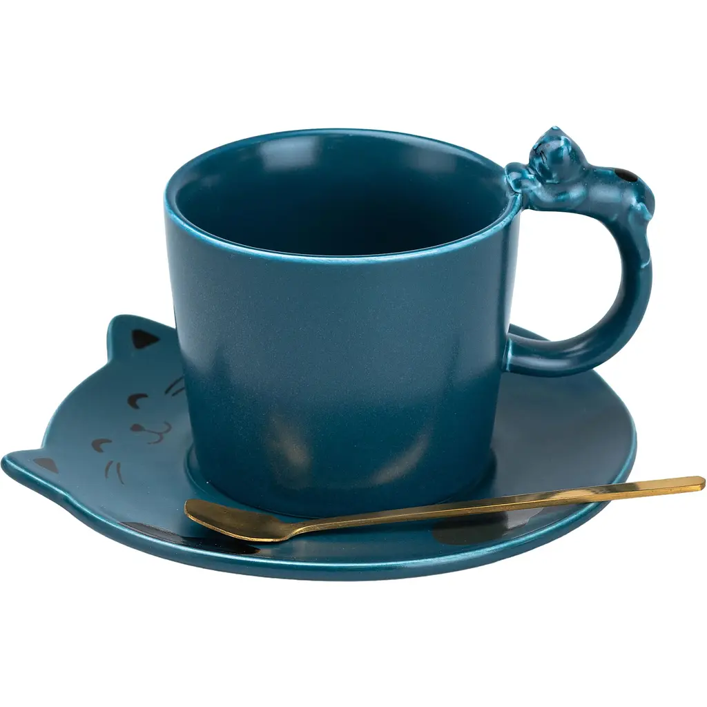 До комплекту входить чашка, блюдце та ложка. Чашка з блюдцем виготовлені з якісної кераміки, а ложка з нержавіючої сталі. На ручці чашки розміщений котик, що робить її чудовим подарунком для будь-якого любителя цих пухнастиків.