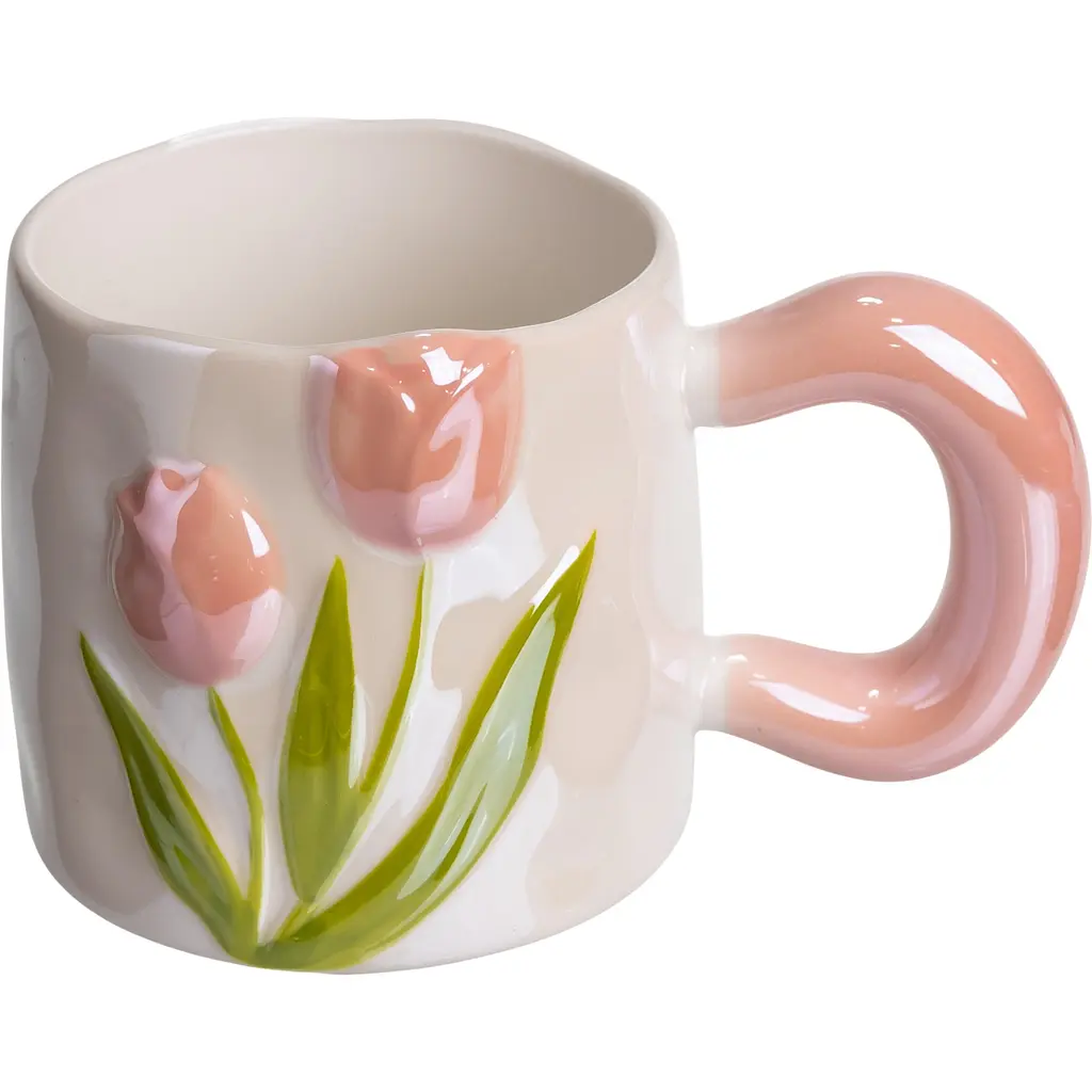 Зовнішня частина прикрашена об’ємним декоративним зображенням тюльпана, виконаним із тієї ж порцеляни, що й корпус чашки. Такий декор створює приємний візуальний акцент і додає виробу ніжності та елегантності, зберігаючи при цьому його стриманий стиль. Ручка плавної, зручної форми забезпечує комфортне тримання навіть під час щоденного використання.