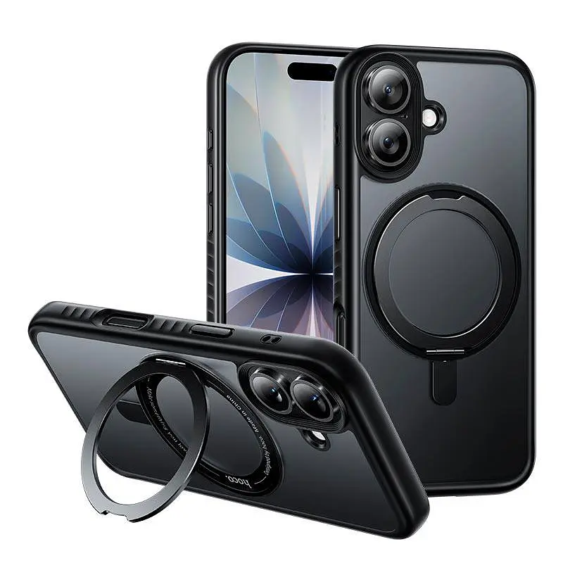 Гібридний чохол (TPU/PC). Має вбудоване магнітне кільце для кріплення до MagSafe-аксесуарів (зарядок, тримачів). Кільце розкладається в підставку, кут нахилу регулюється. Захищає корпус від ударів та подряпин. Всі порти та кнопки залишаються доступними.