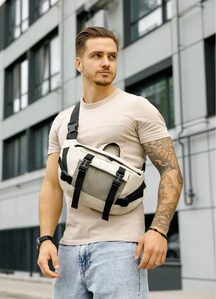 Функціоналість: ззовні спереду сумки кишеня з сітки. Всередині сумки, окрім основного відділення, є дві відкриті кишені, одна велика кишеня на блискавці, в якій три відкритих відділення. Ззовні на спинці сумки дві відкриті кишені, куди легко поміститься телефон та інші дрібниці. Стандартний обхват (сумка з ременем) становить від 86 см до 168 см (довжина регулюється). При замовленні в коментарі зазначте необхідну довжину ременя, якщо вона відрізняється від стандартної.