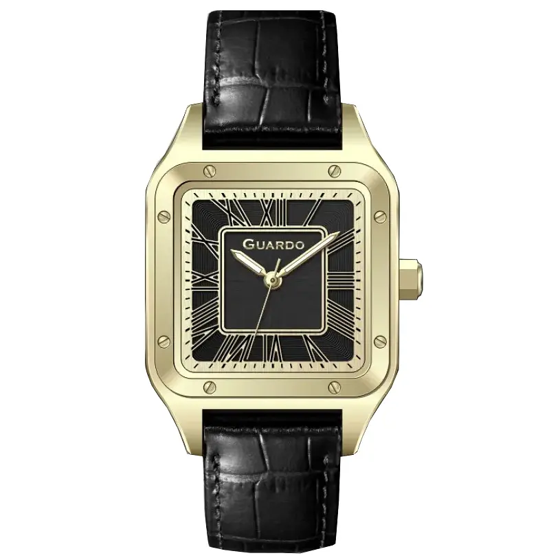 Представляємо годинник GUARDO 012835-4 — елегантний аксесуар для стильних чоловіків. Цей класичний кварцовий годинник поєднує в собі витонченість і функціональність. Його квадратний корпус із неіржавкої сталі в золотистому кольорі підкреслює стриманий шик, а чорний шкіряний ремінець надає особливого шарму.