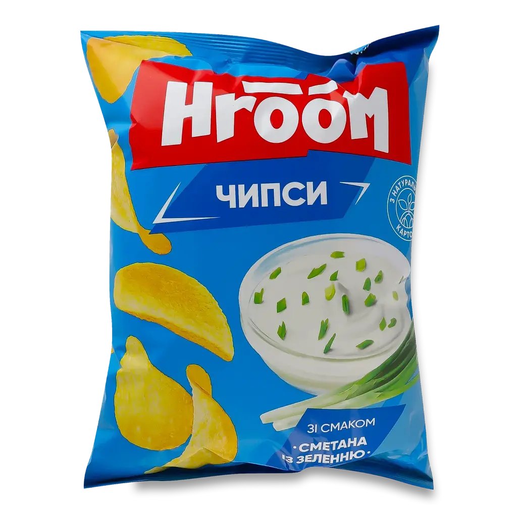Чипси Hroom! - це популярна закуска, яка поєднує в собі хрумку текстуру картопляних чипсів з насиченим і глибоким смаком сметани та зелені.