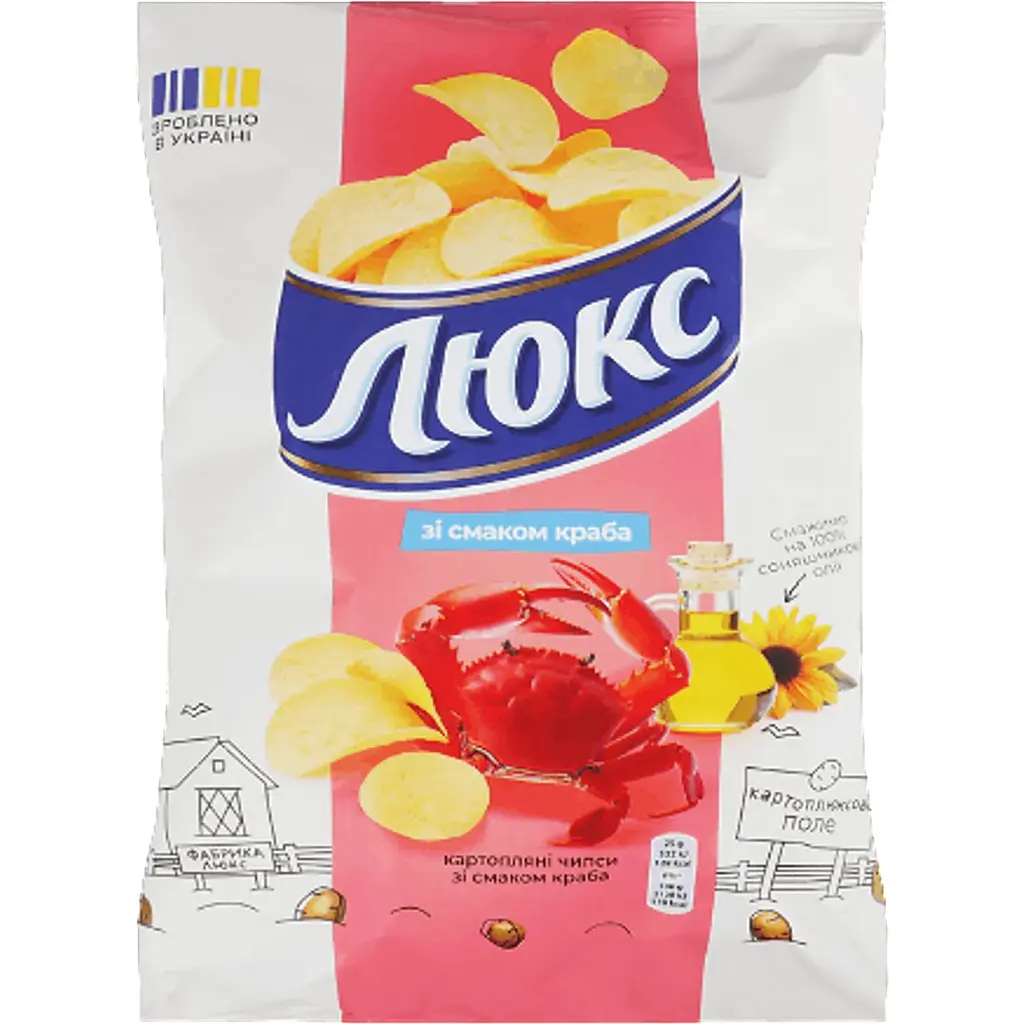 Люкс - торгова марка, яка протягом багатьох років радує нас смачними та якісними закусками на українському та міжнародному ринку. Чипси виготовляються лише з високоякісних продуктів. Смаковим властивостям і якості приділяється особлива увага, перевіряються інгредієнти, щоб споживачі отримували краще.