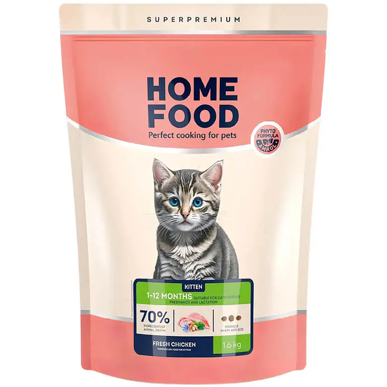 Сухий корм для кошенят Home Food Fresh з куркою виготовлений на основі свіжого м’яса курятини, яке є джерелом легкозасвоюваних тваринних протеїнів. Корм повністю задовольняє зростальний організм малечі необхідними поживними речовинами та енергією для здорового росту і розвитку.