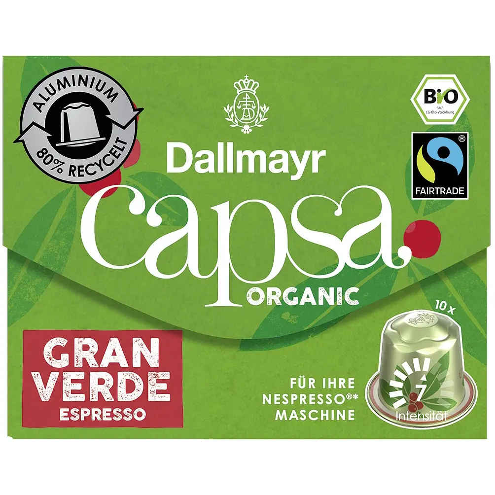 Кава в капсулах Dallmayr Gran Verde, Bio Espresso має інтенсивне, м'яке обсмаження - це надає напою специфічного, насиченого смаку еспресо. Ідеально підходить для приготування ристрето, еспресо та лате макіато або капучино.