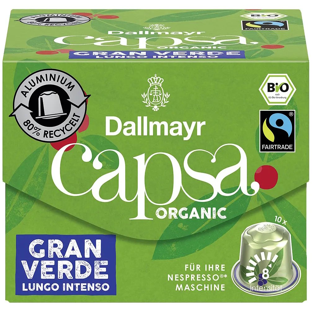 Кава в капсулах Dallmayr Gran Verde, Bio Lungo Intenso ідеально підходить для лунго або лате макіато чи капучино. Темна ступінь обсмаження дарує напою насичений, багатий смак.