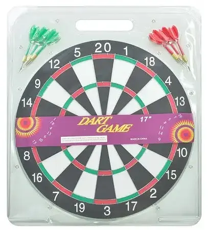 Дартс MS 0097 - гра, яка захопить як дитину, так і дорослого. Ця гра може послужити звичайним придбанням для розваг або ж хорошим подарунком.Для дітей ця гра підходить віком від п'яти років і вище.Дартс MS 0097 відмінно підійде як для любителів, так і для новачків.Завдяки цій грі Ви зможете відмінно провести час вдома, в офісі в обідню перерву і брати її на відпочинок.Дитині ж буде цікаво спробувати свої сили в цій грі, до того ж вона розвиває влучність, концентрацію уваги і спритність рук.Дартс MS 0097 виконаний в класичній стилістиці. Його легко розмістити в зручному для Вас місці.Мішень має дві ігрових моделі для різних варіантів гри.Сама основа виконана з рослинного волокна, завдяки чому дротики добре триматися при кидку.Самі дротики представлені в двох кольорах, з алюмінієвим наконечником. Характеристики:Розмір мішені 17 дюймів (43 см), товщина - 1,25 см.Вага гри - 946 мУ комплекті шість дротиків.Упакована в слюди: 46,5 х 49 х 1,5 см.