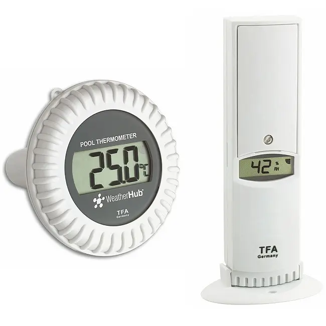 Виробник: TFA Dostmann GmbH & Co.KG, GermanyОсобливості:Передавач для системи WEATHERHUB SmartHomeПеревіряйте дані в будь-який час і в будь-якому місці через смартфонДатчик басейну контролює температуру води в басейні, джакузі або ставкуДатчик температури / вологості контролює температуру і вологість (в приміщенні або на вулиці) і передає дані датчика басейну на шлюзРегульовані межі спрацьовування сигналізації, push-повідомлення в разі спрацювання сигналізаціїПам'ять до 90 днівТільки для роботи зі шлюзом WEATHERHUB (продається окремо)Тепер ви можете використовувати свій смартфон для мобільного моніторингу клімату та будинку! За допомогою системи WeatherHub SmartHome ви можете легко відстежувати погоду, температуру та іншу інформацію у вашому будинку і саду. Встановіть передавач саме там, де ви хочете вимірювати кліматичні дані. Певні значення передаються по бездротовій мережі на модуль шлюзу, а потім на сервер. Ви можете отримати інформацію на своєму смартфоні в будь-який час і залишатися в курсі, де б ви не знаходились. Системою WeatherHub SmartHome можна швидко і легко управляти за допомогою безкоштовного додатку.Цей передавач WeatherHub надійно відображає температуру і вологість в приміщенні або на вулиці. Крім того, передавач для басейну дозволяє контролювати температуру в басейні, джакузі або ставку.ВАЖЛИВО! Для роботи з цим передавачем вам знадобиться шлюз WEATHERHUB. Шлюз можна придбати окремо в якості стартового набору в поєднанні з одним або декількома передавачами. Потім цей набір може бути доповнений до 50 додаткових передавачів і пристроїв, що підключаються.