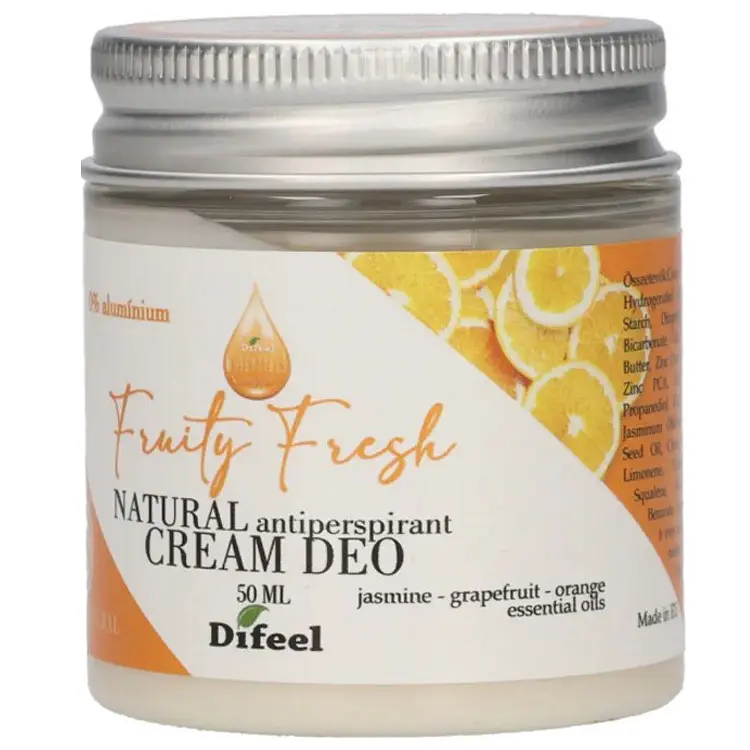 Дезодорант-крем Difeel Fruit Fresh призначений для протидії неприємним наслідкам потовиділення та збереження природної свіжості протягом дуже довгого часу. Зі 100% натуральними інгредієнтами, вмістом медичної шавлії, олії ши та ефіру лимонної кислоти, без солей алюмінію, забезпечує надійний захист від неприємних запахів тіла. Суміш масел жасмину, грейпфрута та апельсина забезпечує свіжість та приємний аромат.
