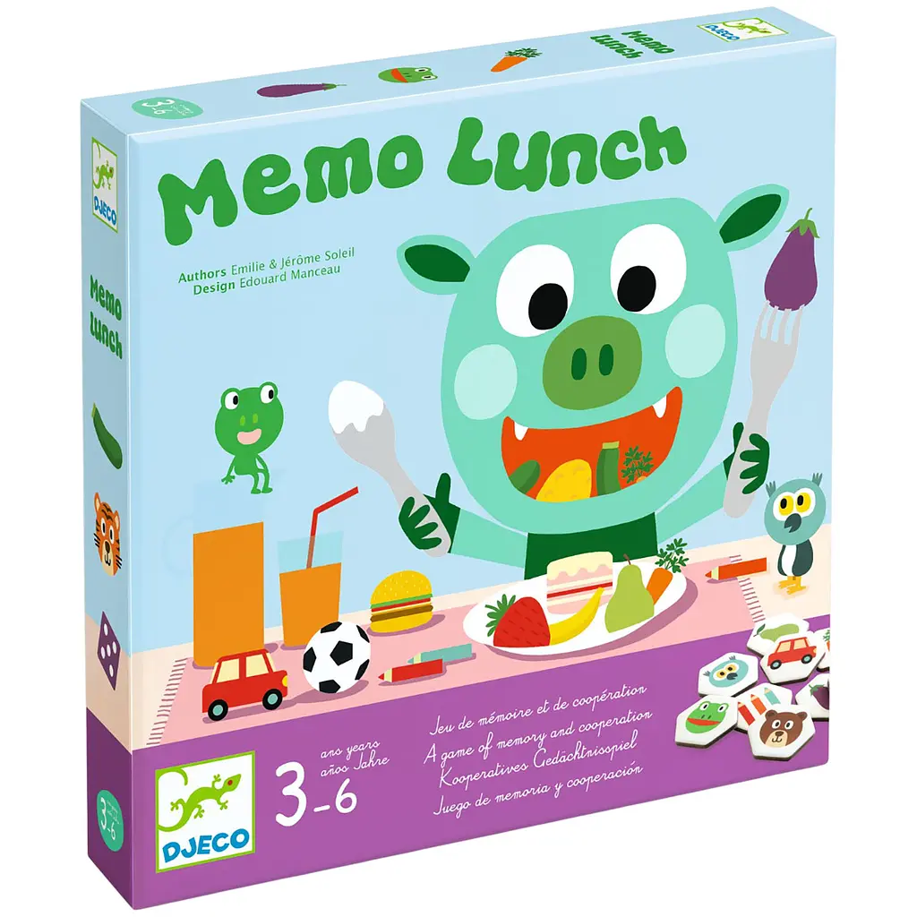 Випробуйте новий поворот в іграх на пам'ять з Djeco Memo Lunch Game! Слідкуйте за предметами, які проковтнув Боб у цій швидкій та складній грі. Ідеально підходить для тренування пам'яті та розваги. Приєднуйтесь до Боба у його незвичайному апетиті та перевірте свою пам'ять!