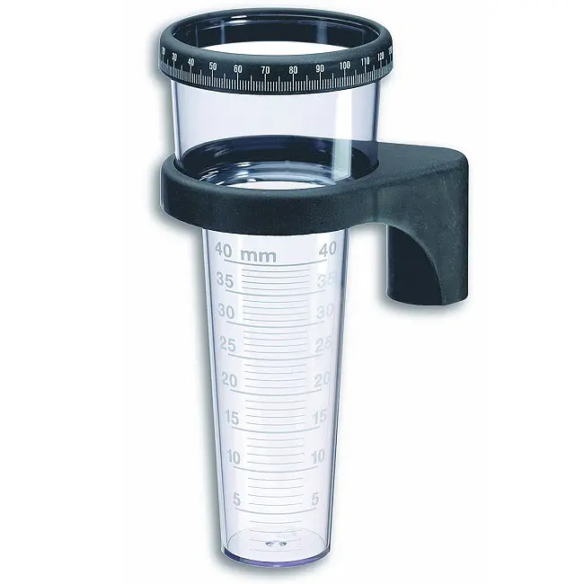 Практичний дощомір для легкого і точного визначення кількості опадів, виготовлений з високоякісного і стабільного пластика. Щоб результат був якомога більш точним, датчик дощу повинен бути поміщений на відповідний стрижень на висоті близько одного метра над землею. Він повинен стояти вертикально і не мати перешкод, таких як будівлі або дерева. Вимірювальний циліндр легко знімається з утримувача для спустошення.