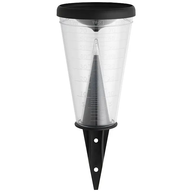 Сучасний дощомір з новим, функціональним дизайном, виконаним з атмосферостійкого пластика, для легкого і точного визначення кількості опадів. Ви отримуєте дуже точні покази завдяки великому діаметру, а шкала легко читається навіть при невеликій кількості опадів. Кришка у формі воронки захищає від випаровування.