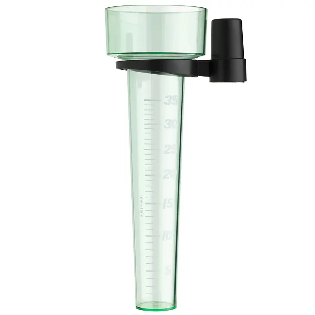 Практичний дощомір для легкого і точного визначення кількості опадів, виготовлений з прозорого зеленого пластика з утримувачем. Щоб результат був якомога більш точним, датчик дощу повинен бути поміщений на відповідний стрижень на висоті близько одного метра над землею. Він повинен стояти вертикально і не мати перешкод, таких як будівлі або дерева. Вимірювальний циліндр легко знімається з утримувача для спустошення.
