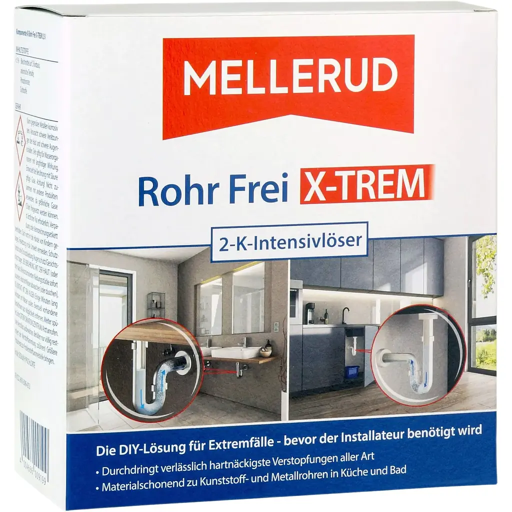 Двокомпонентний засіб Mellerud для видалення волосся у сифонах та трубах має дуже потужну активну формулу проти найстійкіших засмічень у стоках усіх видів, раковинах чи сифонах. Легке застосування в одному кроці без спінювання та випаровування. Обидва компоненти готові до використання. Видаляє засмічення від волосся, залишків мила, шкірних жирів чи зубної пасти у ванній кімнаті. Стоки на кухні також ефективно звільняються від органічних залишків їжі та жиру. Особлива активна формула не викликає нагрівання за сприяння, і це означає, що підходить для всіх типів залізних та пластмасових труб. Неприємні запахи усуваються одразу.